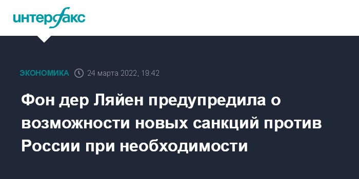 Москва. 24 марта. INTERFAX.RU - Партнеры по G7 готовы при необходимости ввести еще больше ограничительных мер против России, заявила председатель Европейской комиссии Урсула фон дер Ляйен.
