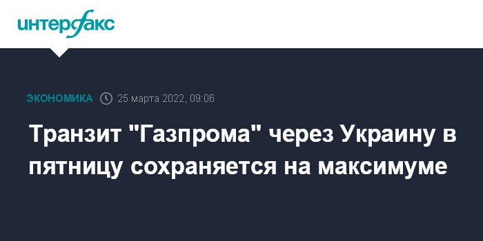 Москва. 25 марта. INTERFAX.RU - Загрузка украинского газотранспортного коридора в пятницу 25 марта сохраняется на прежнем, максимальном уровне долгосрочного контракта (40 млрд кубометров в год, или 109 млн кубометров в сутки).