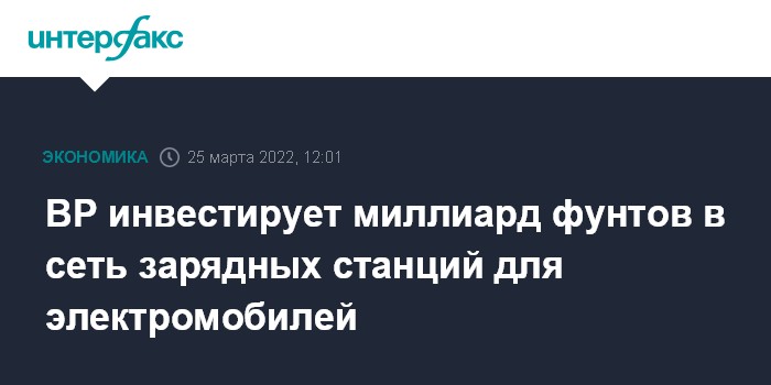 Москва. 25 марта. INTERFAX.RU - Британская энергетическая компания BP Plc планирует инвестировать 1 млрд фунтов стерлингов ($1,32 млрд) в течение десяти лет в строительство новых станций для зарядки электромобилей в Соединенном Королевстве.