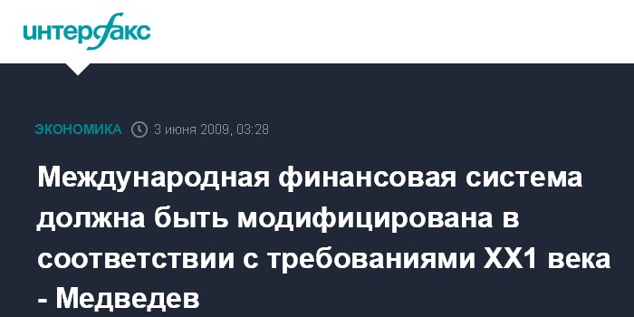 Международная финансовая система должна быть модифицирована в соответствии с требованиями ХХ1 века - Медведев