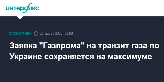 Москва. 28 марта. INTERFAX.RU - Загрузка украинского газотранспортного коридора в понедельник сохраняется на прежнем, максимальном уровне долгосрочного контракта (40 млрд куб. м в год, или 109 млн куб. м в сутки).