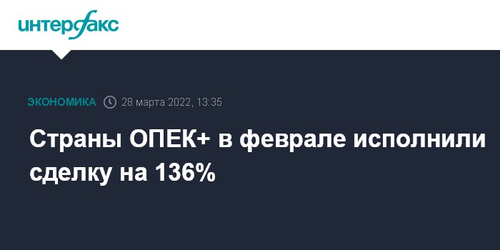 Москва. 28 марта. INTERFAX.RU - Страны ОПЕК+ в феврале исполнили соглашение на 136%, из них страны ОПЕК - на 136%, страны не-ОПЕК - на 135%, сообщил "Интерфаксу" источник, знакомый с отчетом альянса.