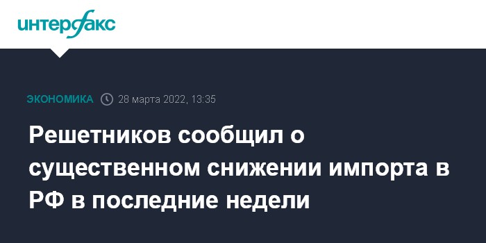 Москва. 28 марта. INTERFAX.RU - Импорт в Россию в последние недели существенно снизился, предпринимаются меры по его стабилизации через упрощение таможенных процедур и выстраивание новых логистических цепочек с новыми поставщиками, рассказал журналистам глава Минэкономразвития РФ Максим Решетников о ситуации в сфере импорта.