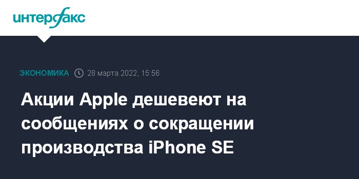 Москва. 28 марта. INTERFAX.RU - Цена бумаг Apple Inc. дешевеет на 1,5% в ходе предварительных торгов в понедельник после сообщения Nikkei Asia о том, что компания планирует сократить производство бюджетных смартфонов модели iPhone SE на 20% во втором квартале.