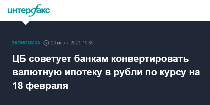 Москва. 28 марта. INTERFAX.RU - Банк России рекомендовал банкам конвертировать валютную ипотеку в рубли по официальному курсу на 18 февраля, пересчет обязательств не должен ухудшать кредитную историю заемщика, говорится в информационном письме регулятора.