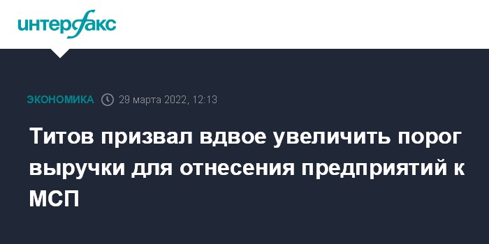 Москва. 29 марта. INTERFAX.RU - Уполномоченный при президенте России по защите прав предпринимателей Борис Титов направил председателю правительства Михаилу Мишустину предложение вдвое увеличить предельные значения годовой выручки, позволяющие отнести субъекты хозяйственной деятельности к категории малого и среднего предпринимательства (МСП).