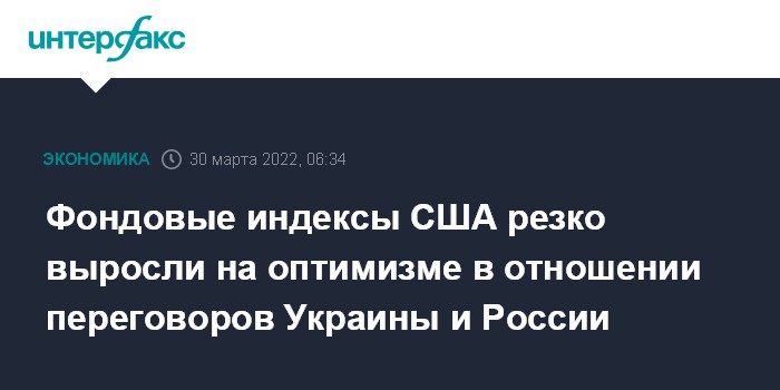 Москва. 30 марта. INTERFAX.RU - Американские фондовые индексы завершили существенным подъемом торги во вторник благодаря оптимизму инвесторов по поводу итогов первых за две недели очных переговоров представителей России и Украины.