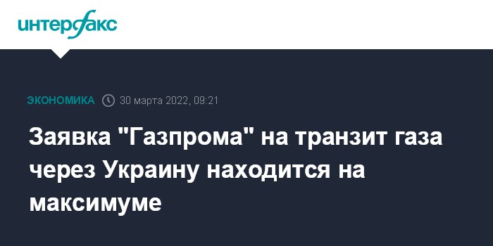 Москва. 30 марта. INTERFAX.RU - Загрузка украинского газотранспортного коридора в среду сохраняется на прежнем, максимальном уровне долгосрочного контракта (40 млрд кубометров в год, или 109 млн кубометров в сутки).
