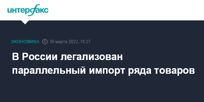 "Еще один подписанный документ касается так называемого параллельного импорта. Цель этого механизма - удовлетворить спрос на товары, содержащие результаты интеллектуальной деятельности. До сих пор их нельзя было продать на территории нашей страны без разрешения правообладателя", - сообщил премьер-министр РФ Михаил Мишустин в ходе заседания президиума правительственной комиссии по повышению устойчивости российской экономики в условиях санкций.