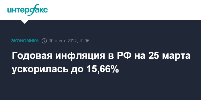 Годовая инфляция в РФ на 25 марта ускорилась до 15,66% (максимума с сентября 2015 года) с 14,5% - на 18 марта, 12,5% - на 11 марта, 10,4% - на 4 марта, 9,15% - на конец февраля, 8,73% - на конец января и 8,39% - на конец декабря.