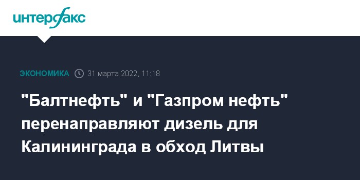 "У двух брендов, которые везли себе цистерны дизеля через одну компанию, у "Балтнефти" и у "Газпром нефти", (. . .) с дизелем сложности. Они, к сожалению, самостоятельно пытались решать это (. . .) с 9 марта - вопрос со своим экспедитором, который вез для них эти цистерны с дизелем в наш регион через территорию Литвы. К сожалению, эта экспедиторская компания оказалась в санкционном списке, и они сейчас перенаправляют эти цистерны на паромную переправу в Усть-Лугу и довезут этот свой дизель уже через паром", - написал чиновник в Telegram.