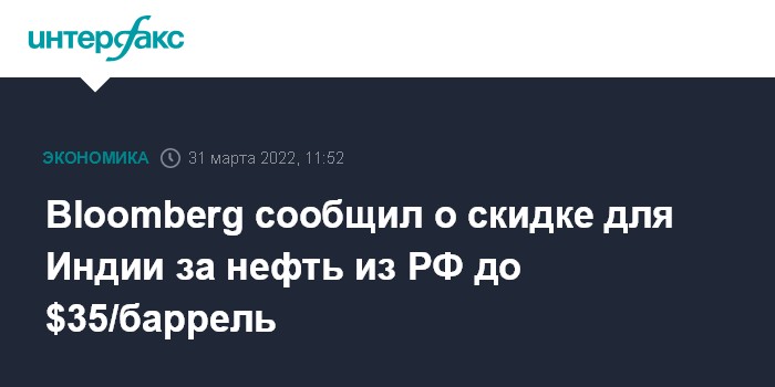 Москва. 31 марта. INTERFAX.RU - Россия готова предоставить Индии большие скидки на прямые продажи нефти на фоне международного давления и снижения спроса на российское сырье после начала военный действий в Украине, сообщает Bloomberg со ссылкой на источники.