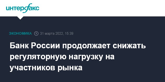 Москва. 31 марта. INTERFAX.RU - Банк России продолжает снижать регуляторную нагрузку на участников рынка - управляющих компаний, спецдепозитариев, профучастников и НПФы, говорится в "Информационном письме" на сайте ЦБ.