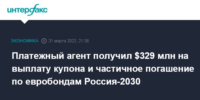 Платежный агент получил $329 млн на выплату купона и частичное погашение по евробондам Россия-2030