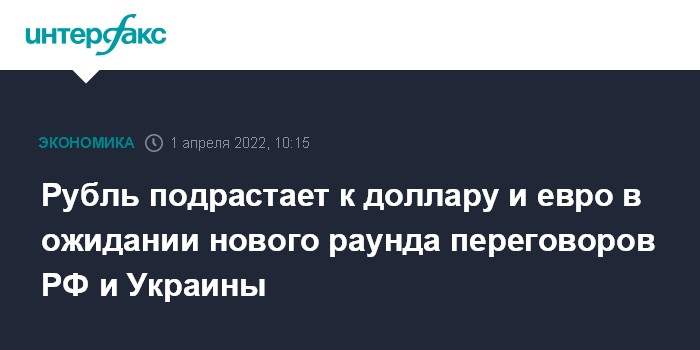 Как отмечают эксперты "Интерфакс-ЦЭА", рубль растет к доллару и евро на старте торгов в ожидании российско-украинских переговоров, которые, как ожидается, возобновятся в пятницу, 1 апреля, в онлайн-формате. Кроме того, с сегодняшнего дня Россия вводит новую систему расчетов в рублях за поставляемый в "недружественные страны" природный газ.