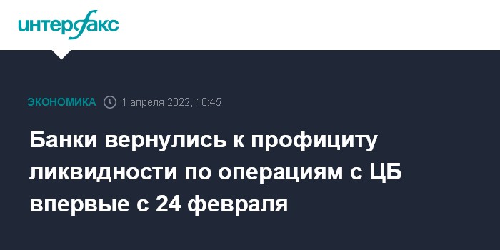 Банки вернулись к профициту ликвидности по операциям с ЦБ впервые с 24 февраля