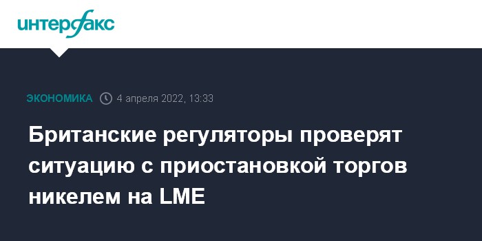 Москва. 4 апреля. INTERFAX.RU - Британские финрегуляторы начали проверку действий Лондонской биржи металлов (LME), остановившей торги никелем в марте, и дали понять, что ждут от биржи серьезных действий для предотвращения подобных инцидентов в будущем.