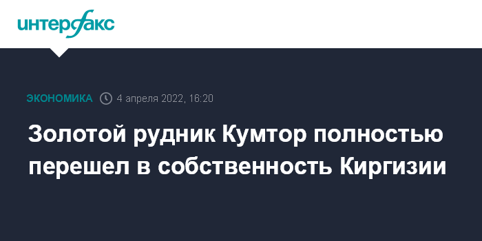 Москва. 4 апреля. INTERFAX.RU - Золоторудное месторождение Кумтор полностью перешло в собственность Киргизии, заявил президент республики Садыр Жапаров.