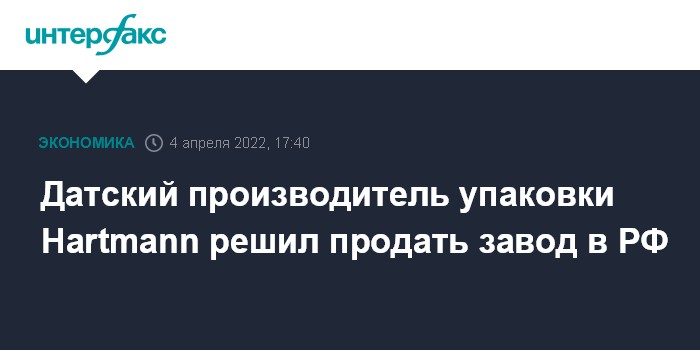 Москва. 4 апреля. INTERFAX.RU - Датский Brodrene Hartmann A/S, который занимается производством упаковки из бумажного волокна для яиц и фруктов, а также оборудования для выпуска такой упаковки, принял решение продать завод в РФ.