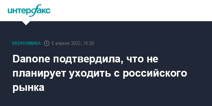 2 марта Danone объявила, что не планирует уходить из РФ, 7 марта компания уточнила, что приостанавливает инвестиции в РФ, но продолжит производство и дистрибуцию молочных продуктов, детского и медицинского питания. При этом Danone не ожидает прибыли от российского бизнеса – головная компания не будет получать дивиденды и другие платежи от российской структуры, а вся прибыль, полученная на рынке РФ, будет направлена на гуманитарные цели.