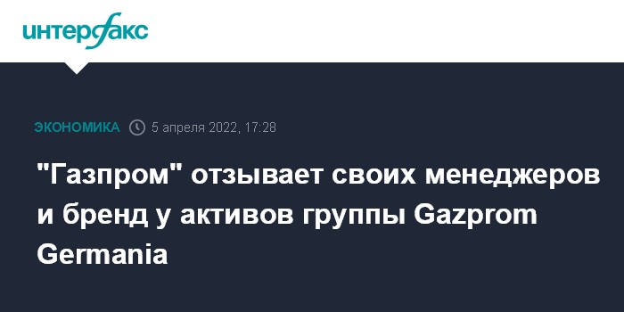 "В связи с прекращением 31 марта 2022 года участия группы "Газпром" в немецкой компании Gazprom Germania GmbH сообщаем следующее. GAZPROM Germania GmbH, ее подконтрольные компании, включая Gazprom Marketing & Trading Ltd., а также их объекты вложений должны прекратить использование товарных знаков "Газпрома", в том числе в наименованиях и фирменной символике, чтобы избежать дальнейшего отождествления их деятельности с группой "Газпром". Группа "Газпром" также отзывает своих представителей из органов управления GAZPROM Germania GmbH, ее подконтрольных компаний и их объектов вложений", - говорится в заявлении.
