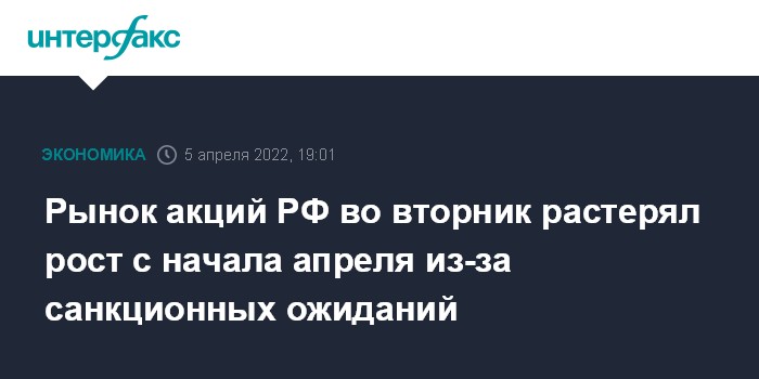 Москва. 5 апреля. INTERFAX.RU - Рынок акций РФ во вторник ощутимо просел, растеряв почти весь рост начала апреля, на ожиданиях объявления нового пакета антироссийских западных санкций из-за военной операции России на Украине, индекс МосБиржи откатился в район 2660 пунктов, при этом выросли бумаги ПАО "Полюс".