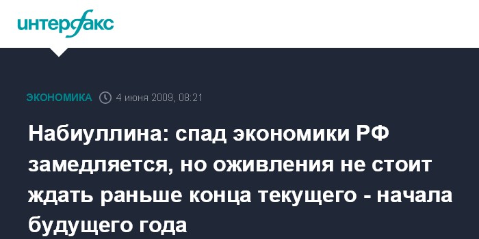 Москва. 4 июня. INTERFAX.RU - Глава Минэкономразвития Эльвира Набиуллина считает, что темпы спада российской экономики в последние недели замедляются, но оживления не стоит ждать раньше конца текущего - начала будущего года.