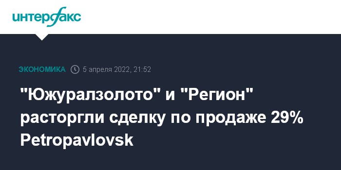 "Южуралзолото" и "Регион" расторгли сделку по продаже 29% Petropavlovsk