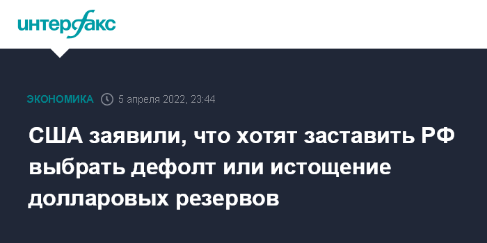 Москва. 5 апреля. INTERFAX.RU - Американские санкции, которые вводит администрация США против России из-за спецоперации на Украине, направлены на то, чтобы заставить Москву выбирать между дефолтом и истощением ее долларовых резервов, заявила во вторник представитель Белого дома Дженнифер Псаки.