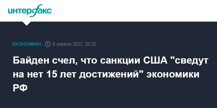 Москва. 6 апреля. INTERFAX.RU - Американские санкции нанесут тяжелый урон экономике России и, вероятно, сведут на нет все ее достижения за последние 15 лет, заявил в среду президент США Джо Байден.