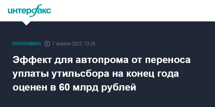 Москва. 7 апреля. INTERFAX.RU - Перенос сроков уплаты утилизационного сбора российскими производителями автомобилей и самоходной техники на конец 2022 года позволит поддержать автопром на 60 млрд рублей, следует из ответа Минэкономразвития на вопросы депутатов комитета Госдумы по экономической политике.