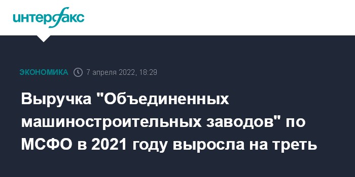 Москва. 7 апреля. INTERFAX.RU - Консолидированная выручка ПАО "Объединенные машиностроительные заводы" по МСФО в 2021 году выросла на 29% - до 55,3 млрд рублей, оправдав оценки руководства.