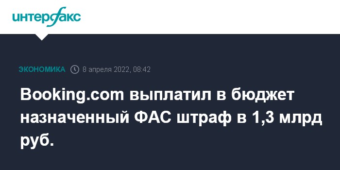 Москва. 8 апреля. INTERFAX.RU - Компания Booking.com выплатила в федеральный бюджет наложенный Федеральной антимонопольной службой (ФАС) штраф в размере 1,3 млрд руб. Соответствующий отчёт был получен со стороны компании, сообщила пресс-служба ФАС.