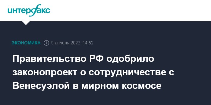 Москва. 9 апреля. INTERFAX.RU - На заседании кабмина РФ в пятницу был одобрен законопроект о сотрудничестве с Венесуэлой в космической сфере, говорится в сообщении на сайте правительства.