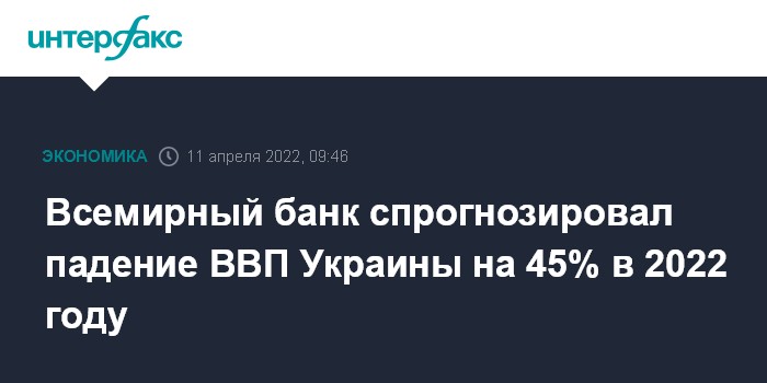 Москва. 11 апреля. INTERFAX.RU - ВВП Украины в 2022 году упадет на 45,1%, прогнозирует Всемирный банк.