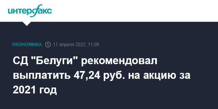 Москва. 11 апреля. INTERFAX.RU - Совет директоров ПАО "Белуга Групп" рекомендовал акционерам утвердить выплату дивидендов по итогам 2021 года в размере 47,24 рубля на акцию, сообщила компания.