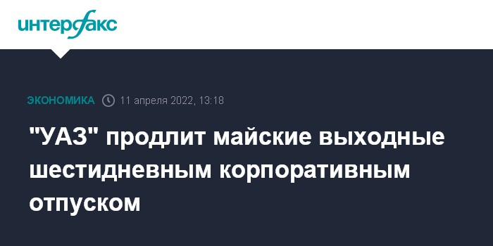 Москва. 11 апреля. INTERFAX.RU - ООО "Ульяновский автомобильный завод" ("УАЗ", основной актив ПАО "Соллерс Авто") объявит корпоративный отпуск на шесть рабочих дней в первой половине мая: с 4 по 6 и с 11 по 13 мая, сообщила пресс-служба "Соллерс Авто".