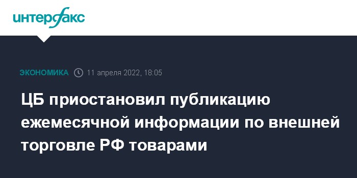 Москва. 11 апреля. INTERFAX.RU - Банк России временно приостановил публикацию ежемесячной информации по внешней торговле Российской Федерации товарами (по методологии платежного баланса).