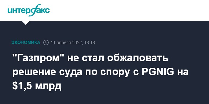 "11 апреля 2022 года Апелляционный суд округа Свеа в Стокгольме уведомил компанию о том, что "Газпром" не обжаловал решение в установленный срок, что означает, что решение стало окончательным и обязательным, и что у "Газпрома" юридические средства для оспаривание решения трибунала исчерпаны", - заявила PGNiG.