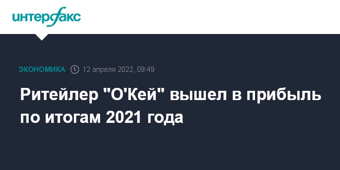 Москва. 12 апреля. INTERFAX.RU - Сеть гипермаркетов "О'Кей" в 2021 году получила 208 млн рублей чистой прибыли по МСФО против убытка в 1,44 млрд рублей годом ранее, сообщил ритейлер.