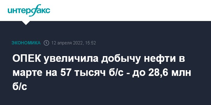 Москва. 12 апреля. INTERFAX.RU - Страны ОПЕК в марте увеличили добычу на 57 тысяч баррелей в сутки к уровню февраля - до 28,55 млн б/с, говорится в отчете организации со ссылкой на данные вторичных источников.