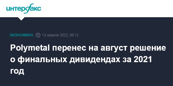 Москва. 13 апреля. INTERFAX.RU - Совет директоров Polymetal перенес утверждение решения о выплате финальных дивидендов за 2021 год на август, когда будет рассматриваться вопрос о промежуточных дивидендах, сообщила компания.