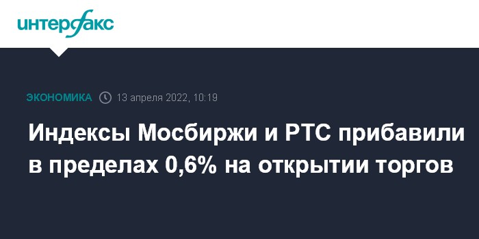Москва. 13 апреля. INTERFAX.RU - В среду торги на российском рынке акций начались в плюсе на фоне улучшения внешней фондовой конъюнктуры и затишья в новостном потоке относительно антироссийских санкций; индексы МосБиржи и РТС за минуту торгов прибавили 0,4-0,6%, в росте пока лидируют бумаги "Аэрофлота" и расписки Ozon.
