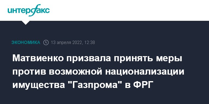 Путин предупредил о последствиях возможной национализации активов РФ за рубежомЧитать подробнее"Прошла информация: Германия готовится к национализации имущества "Газпрома". Новый законопроект министерства экономики Германии среди мер предусматривает передачу в доверительное управление важных энергетических предприятий, а в особенно тяжелой финансовой ситуации их национализацию под видом цели закона - безопасность энергоснабжения и обеспечение дееспособности государства", - сказала Матвиенко на заседании СФ в среду в ходе "правительственного часа" с участием первого вице-премьера Андрея Белоусова.