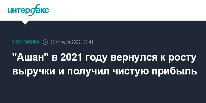 Москва. 13 апреля. INTERFAX.RU - Ритейлер "Ашан" вернулся к росту выручки в России в 2021 году и получил чистую прибыль по РСБУ после убытка годом ранее, свидетельствуют данные отчетности компании.