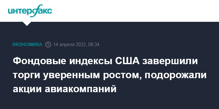 Москва. 14 апреля. INTERFAX.RU - Американские фондовые индексы выросли по итогам торгов в среду благодаря позитивной квартальной отчетности ряда компаний, а также снижению доходностей US Treasuries, поддержавшему технологический сектор.