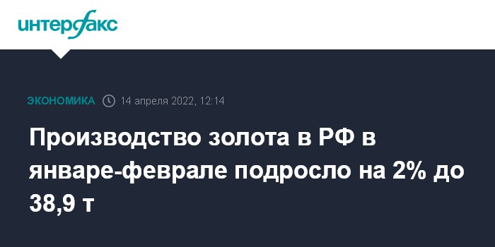 Москва. 14 апреля. INTERFAX.RU - Производство золота в России в январе-феврале 2022 года составило 38,9 тонны, сообщил Минфин со ссылкой на данные о поставках сырья на российские аффинажные заводы.