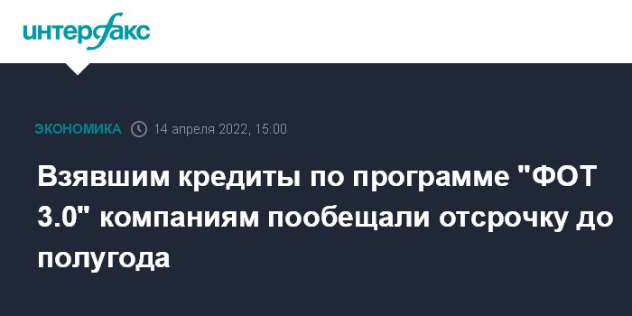 Москва. 14 апреля. INTERFAX.RU - Более 30 тысяч компаний, которые в 2021 году в период ковидных ограничений получили кредиты под 3% по программе "ФОТ 3.0", могут обратиться в банк и взять отсрочку платежей по этим кредитам на любой срок в пределах 6 месяцев, сообщило Минэкономразвития.