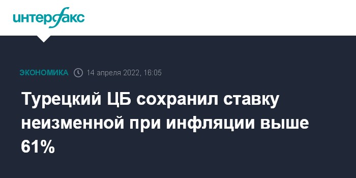 Турецкий ЦБ сохранил ставку неизменной при инфляции выше 61%