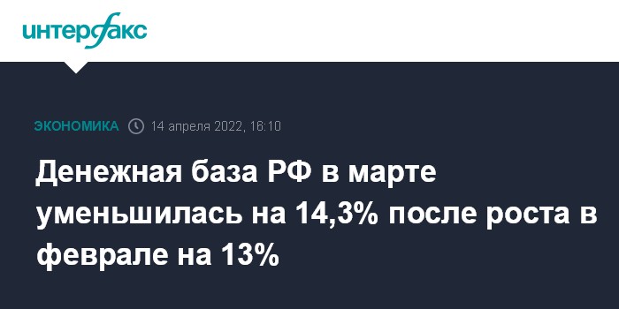 Москва. 14 апреля. INTERFAX.RU - Денежная база РФ в широком определении в марте 2022 года уменьшилась на 3 трлн 190,3 млрд рублей, или на 14,3%, до 19 трлн 186,6 млрд рублей, что примерно соответствует уровню февраля 2021 года. Такие данные содержатся на сайте Банка России.